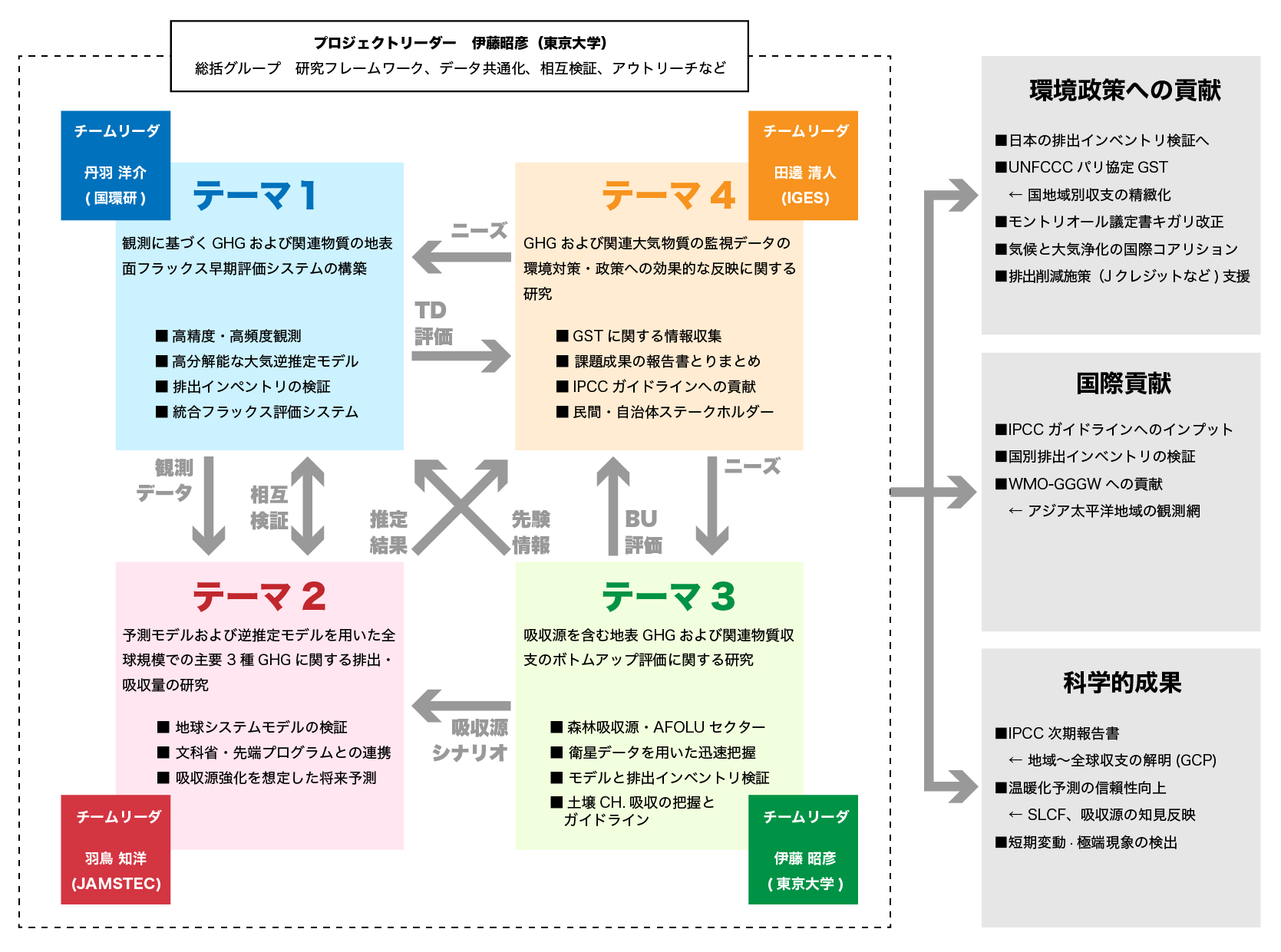 S-22はそのようなニーズに応えるよう構成されており、観測とモデルの融合、そして自然科学と社会科学の連携によって研究を総合的に進めていきます。図1に示すようにS-22は4つのテーマで構成されており、それぞれ、観測をベースとする精密な現状把握、グローバルなモデルを用いた変動メカニズムの理解、地表における排出・吸収の推計、そして政策貢献に向けた活動を進めていきます(詳しくは次節で説明します)。ここでは、日本が持つ様々な研究リソース、例えば温室効果ガス観測技術衛星(GOSAT)シリーズによる観測データ、アジア太平洋地域に展開されている観測ネットワーク、先端的なシミュレーションモデルを活用します。観測とモデル、そして政策指向の研究グループが密に共同研究を行うことで、社会のニーズに迅速かつ臨機応変に応えていくことを目指します。