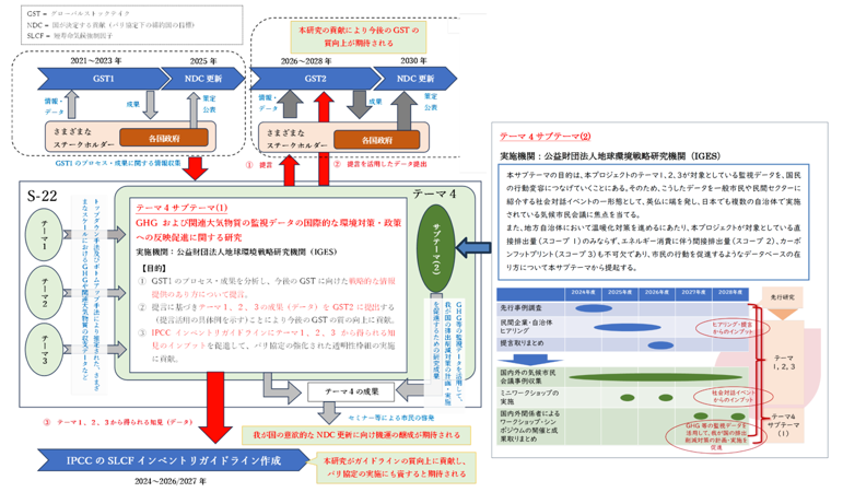 このテーマは本プロジェクトの成果を政策につなげる役割を担っています。いくら高精度な観測やモデル解析を行っても、それを社会のステークホルダーにわかりやすい形で示さないと政策に結びつかないため、多くの科学的なプロジェクトの弱みとなっていました。S-22では、地球環境戦略研究機関(IGES)の社会科学を専門とする研究グループにより、科学と社会の橋渡しが行われます。サブテーマ(1)は世界の気候政策の動向を分析し、本プロジェクトによる大気の監視データを気候変動枠組条約などの環境政策に活かすための戦略を提案します。サブテーマ(2)は国内のステークホルダー(政策担当者など)に本プロジェクトの情報を提供して政策立案を支援していきます。